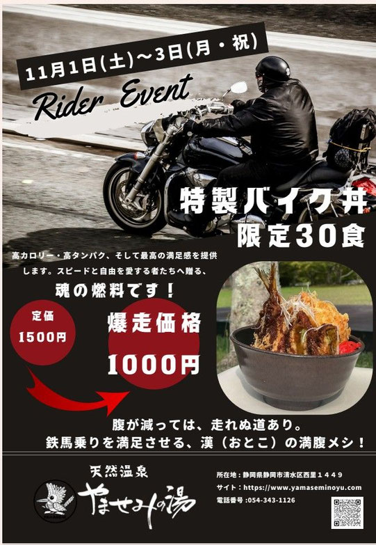 バイク乗りの支配人とバイク乗りの料理人がプロデュースしたやませみの湯❌️やませみの湯バイク丼を期間限定で限定30食販売します。
